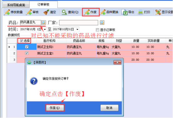 對(duì)已知不能采購的藥品進(jìn)行過濾篩選,單個(gè)或批量作廢,作廢即報(bào)貨失敗;